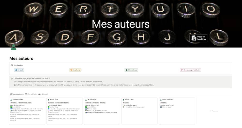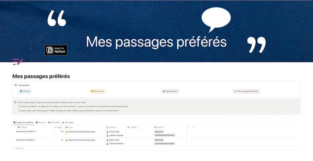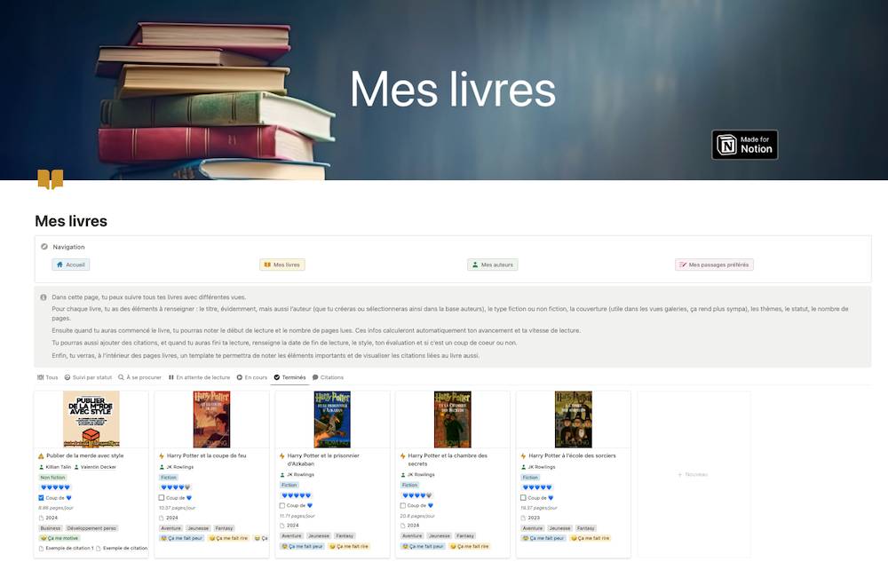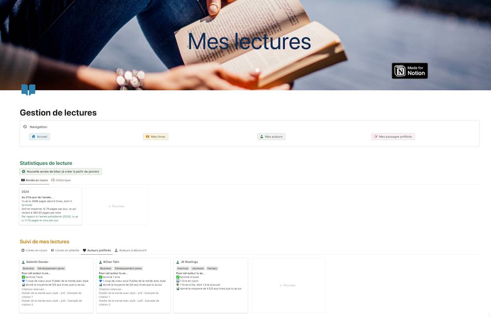 Ce template de gestion de lectures va te permettre d'organiser tes lectures, noter les passages qui t'inspirent, remplir ta wish list mais aussi suivre ta consommation de livres et tes statistiques de lecture !